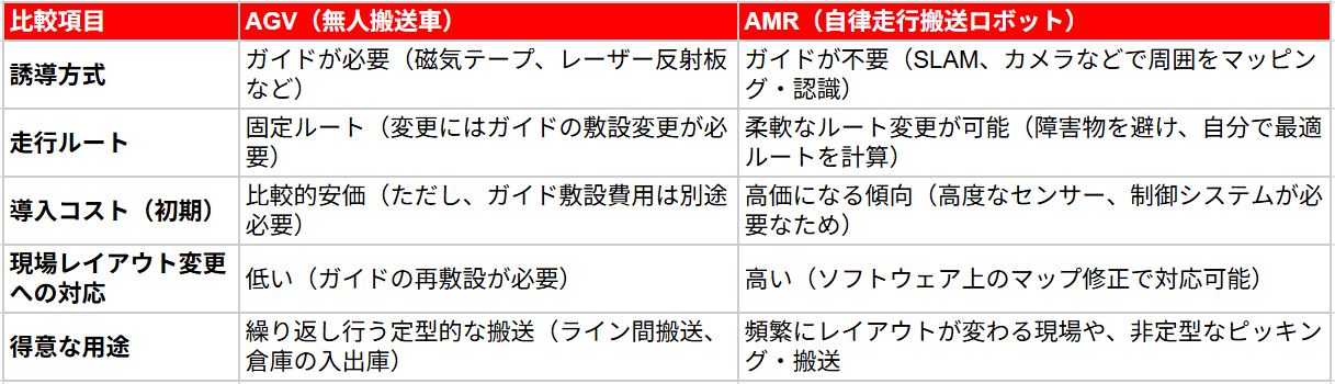 どちらを選ぶかは、現場のレイアウト変更の頻度や搬送ルートの固定性によって判断すべきです。定型的な搬送が主体であれば、導入コストと安定性に優れるAGVが適している場合が多いです。