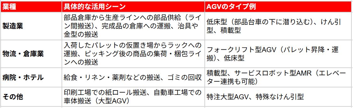 AGVは、その柔軟性から多岐にわたる分野で活用されています。